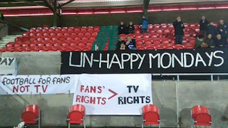 "Aston Villa FC eject fans at home to Man City for standing after 4 minutesof the game. Brigada 1874 were targeted by the club despite the whole Holte End standing and fans complying with stewards request to sit down. The group were told this order had come from Tom Fox. Those ejected were banned for 3 games."